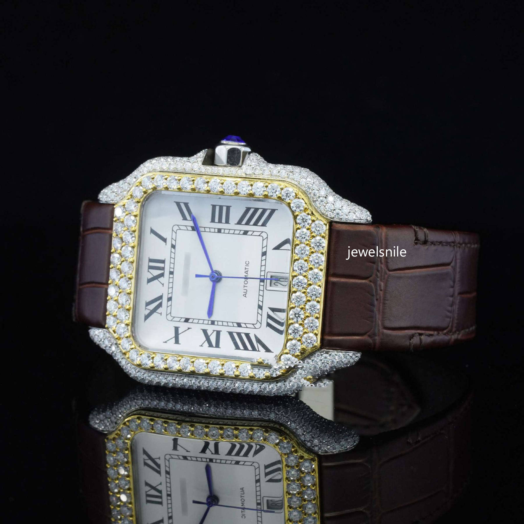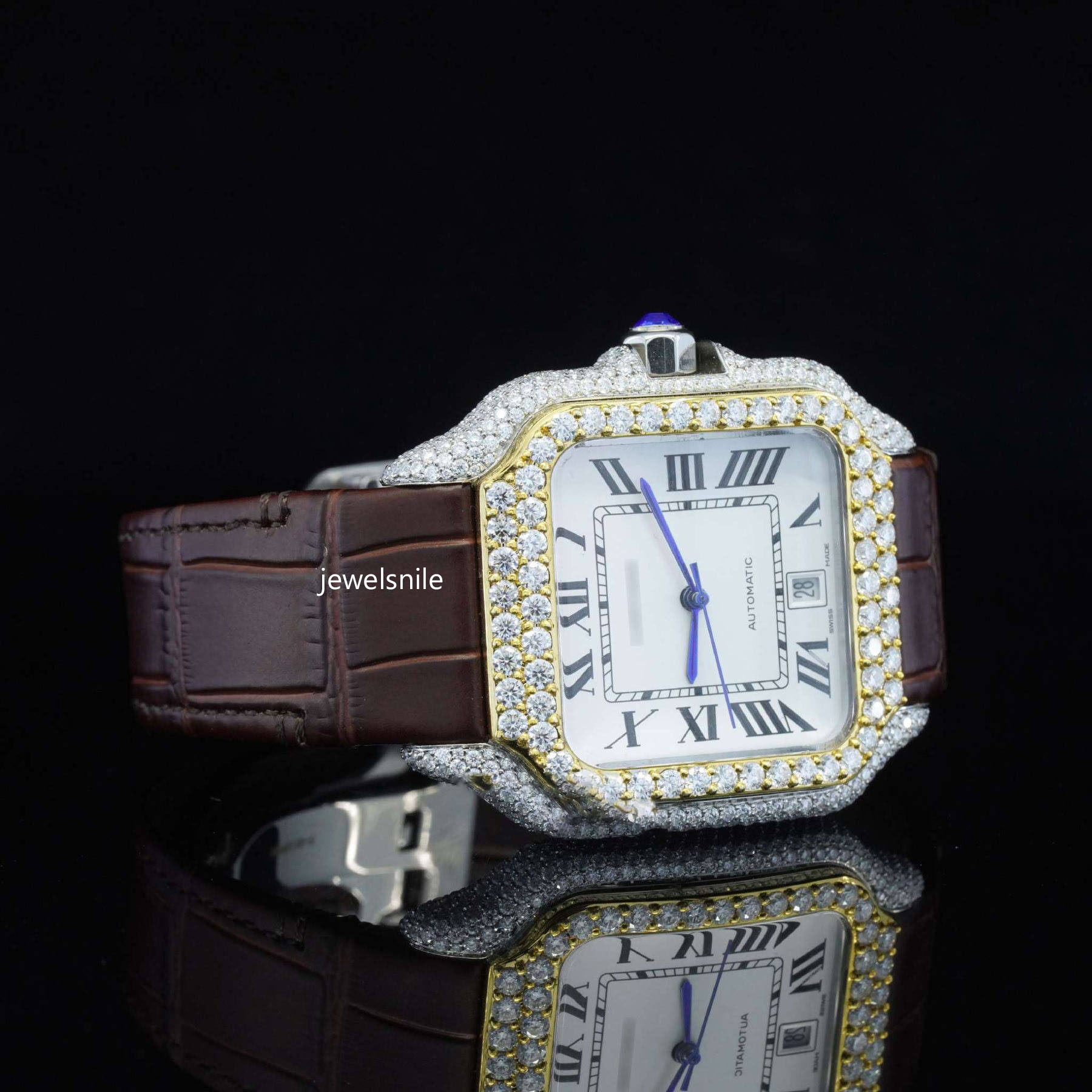 Amazing White Dial With Brown Leather Belt Moissanite Watch Featuring a dazzling 25-28 CT moissanite diamond. diamond tester passed and a modern Japan Automatic Movement watch.