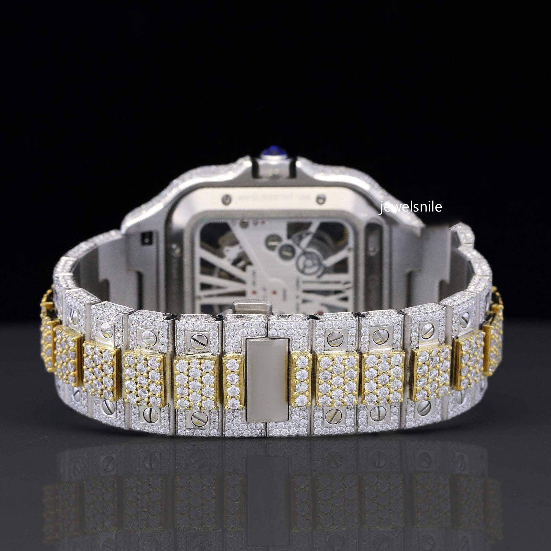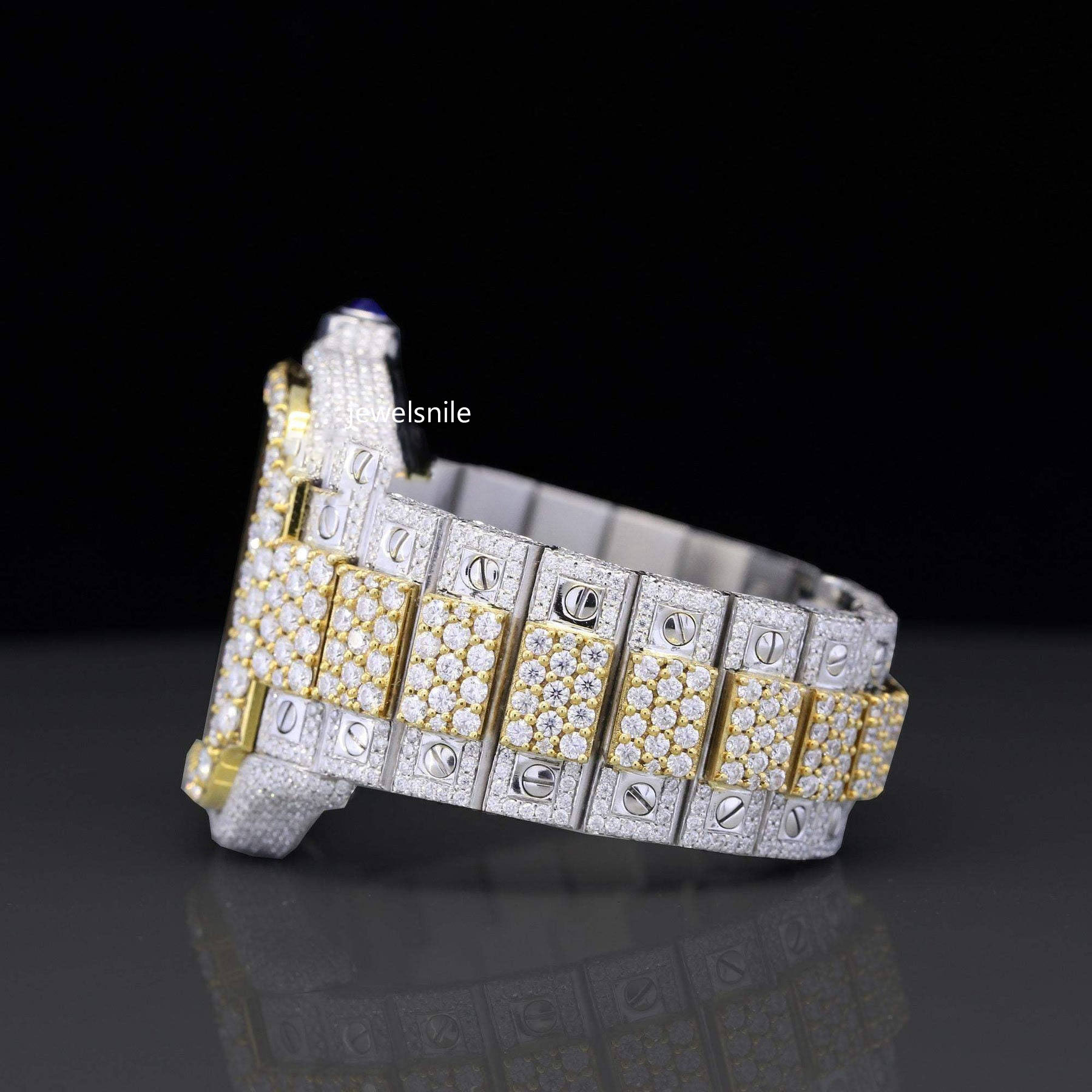 Awesome Iced Out Moissanite Watch For Men Sapphire Crystal Glass a dazzling 25 CT moissanite diamond. Tested by a diamond tester and a sophisticated Japan Automatic Movement watch.
