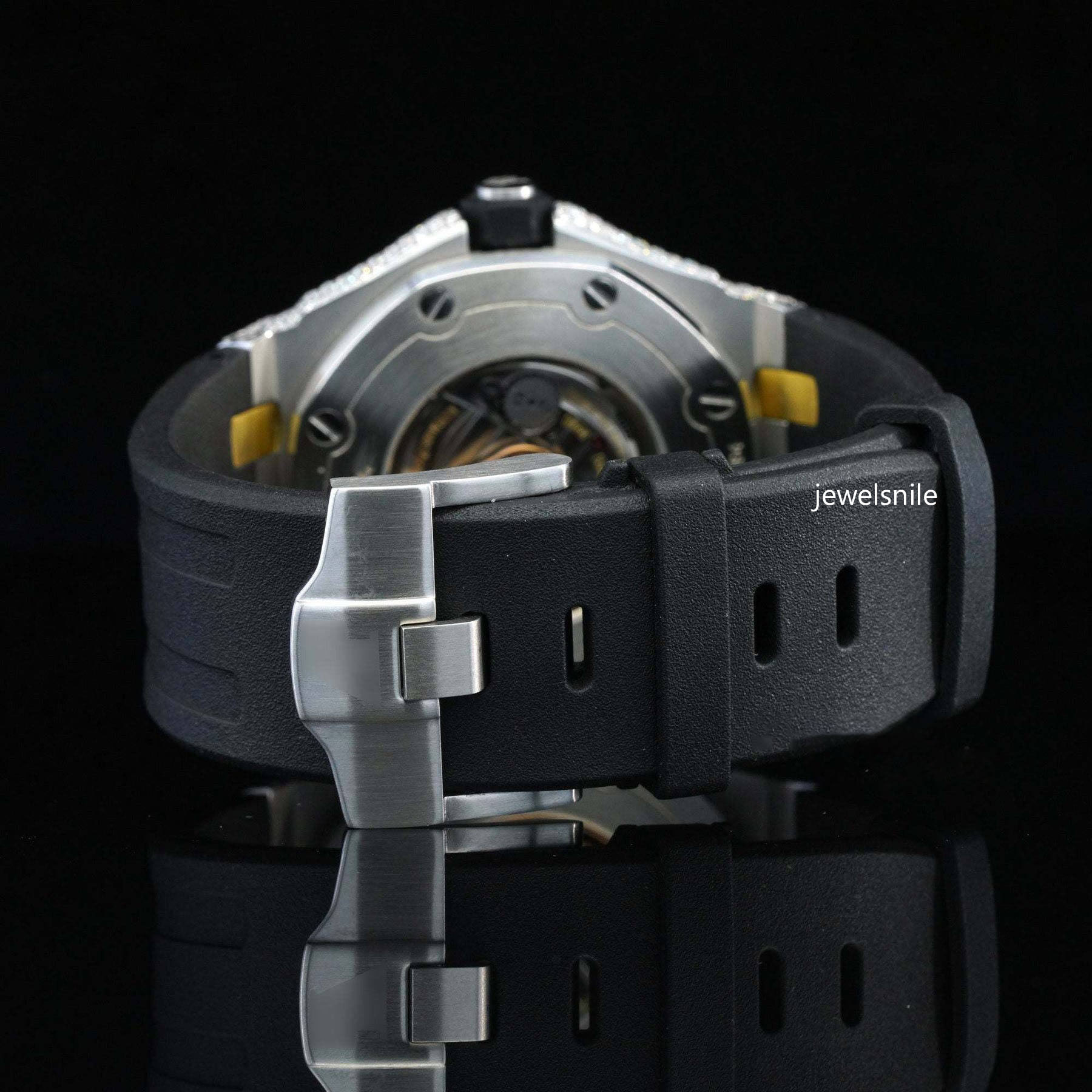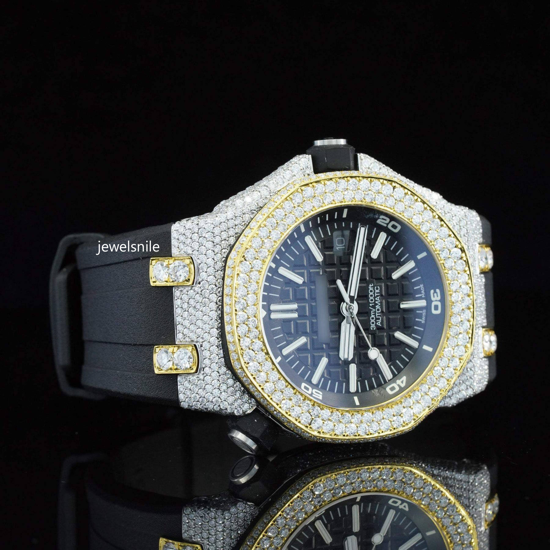 Fabulous Moissanite Wrist Watch With Black Color Belt For Men Featuring a dazzling 25-28 CT moissanite diamond. diamond tester passed and a modern Japan Automatic Movement watch.
