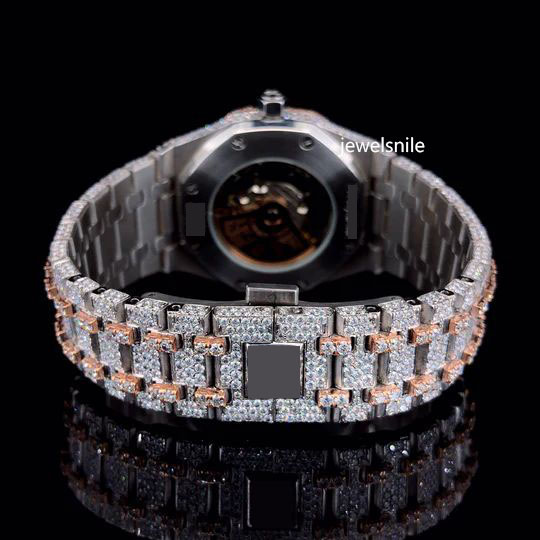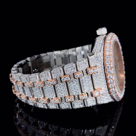 Automatic Roman Number Dial Rose Gold Japan Movement Moissanite Watch with Colate Featuring a dazzling 25-28 CT moissanite diamond. diamond tester passed and a modern Japan Automatic Movement watch.