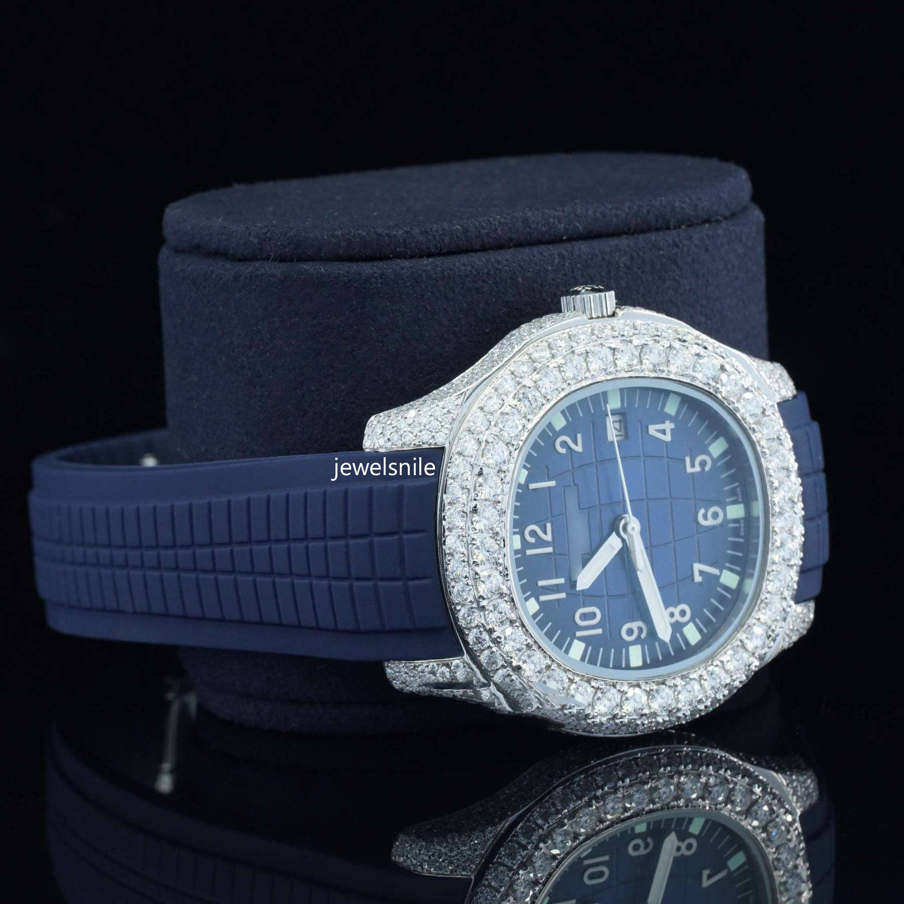 Iced Out Moissanite Watch Blue Color Belt Automatic Watch For Men Featuring a dazzling 25-28 CT moissanite diamond.  diamond tester passed and a modern Japan Automatic Movement watch.