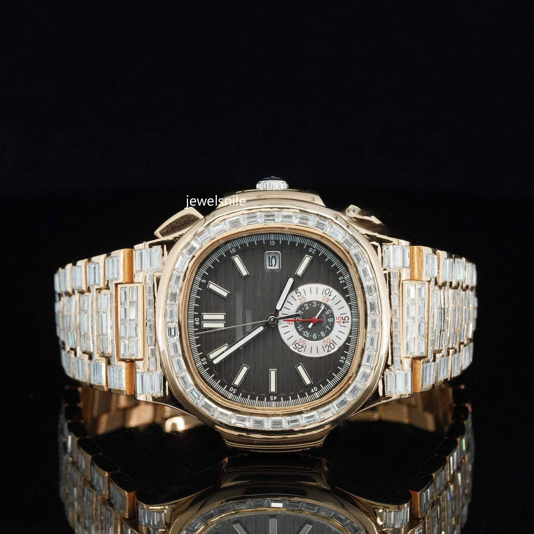 Buy Yellow Gold arabic Dial and automatic fully Iced out Moissanite diamond watch from Jewelsnile.