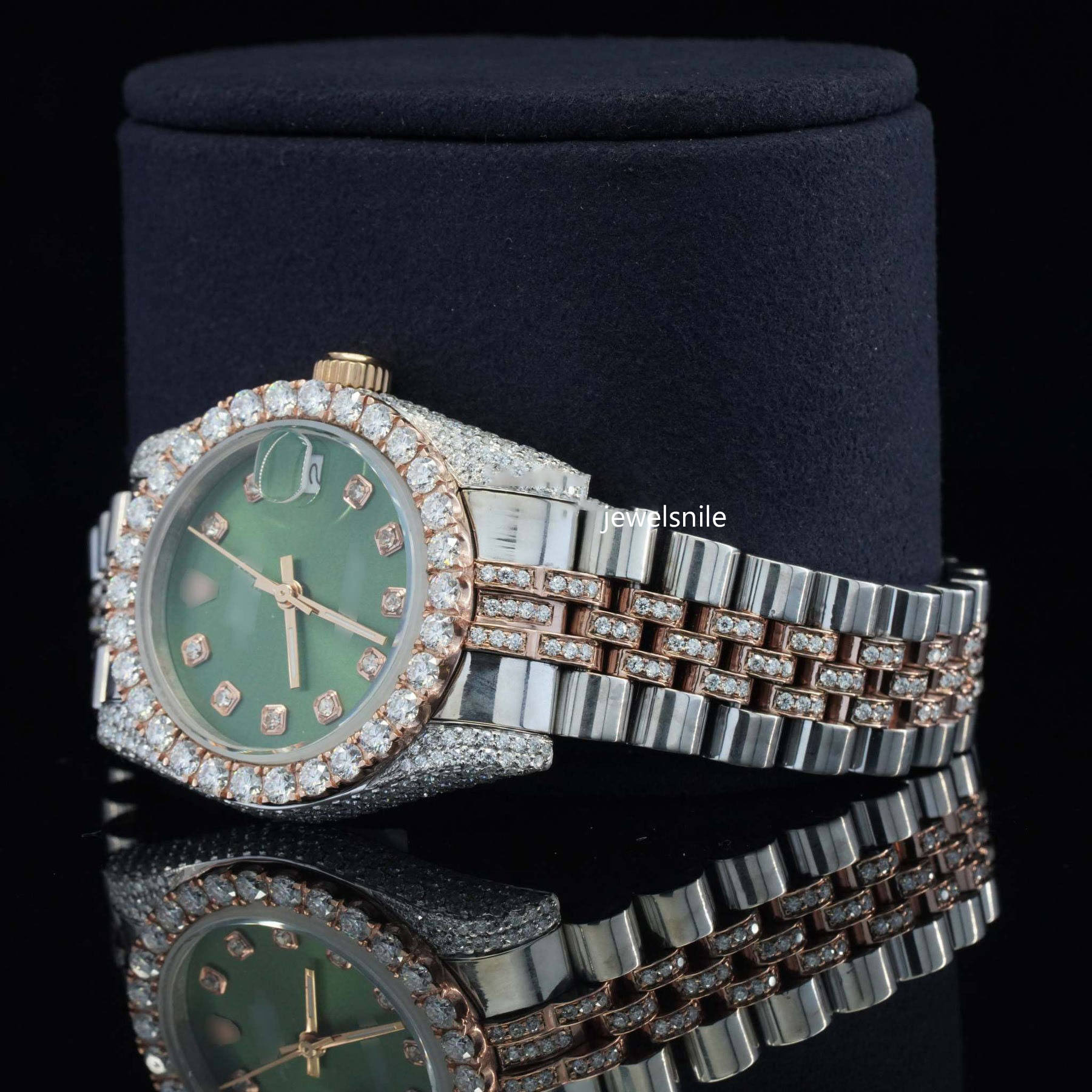 Luxurious Moissanite Automatic Movement Two Tone Watch For Women Featuring a dazzling 25-28 CT moissanite diamond. diamond tester passed and a modern Japan Automatic Movement watch.