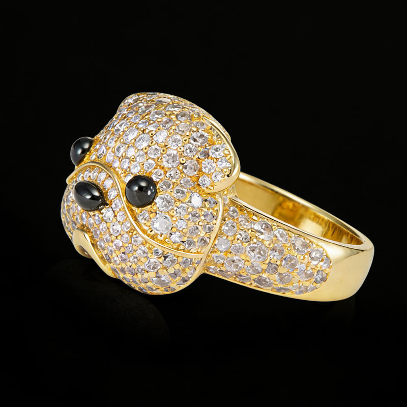 the ring a Sparkling Cubic Zirconia Pet Dog Design Jewelry Bulldog Ring for Women High Quality Lab Grown Stones, iced-out look from every angle. Designed to stand out, this ring blends symbolism with modern street-style flair.