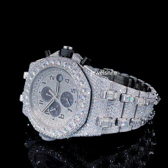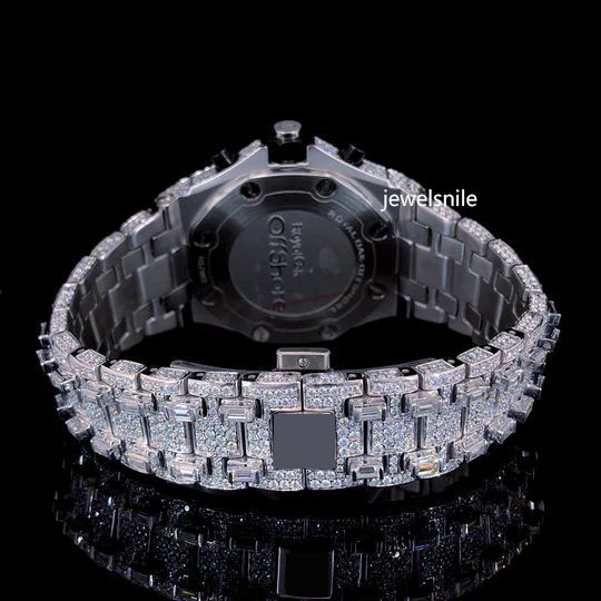 Elegant Big size Automatic Number Dial Automatic Japan Movement round and baguette Moissanite Diamond Watch Featuring a dazzling 25-30 CT moissanite diamond. diamond tester passed and a modern Japan Automatic Movement watch.